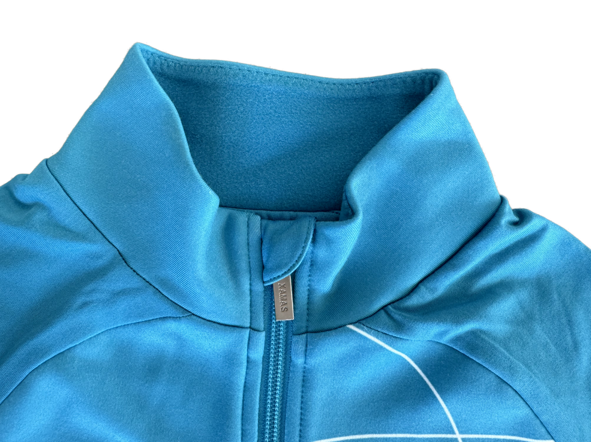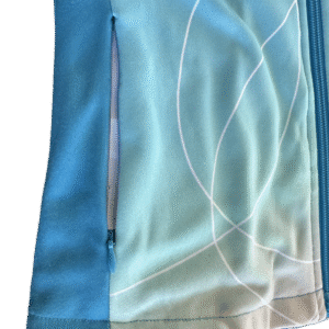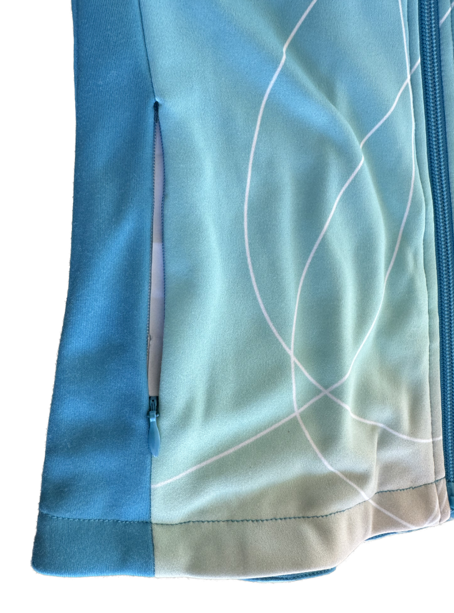 Die Jacke hat zwei sich ergänzende Stoffschichten. Wir erreichten damit einen idealen Wärmehaushalt. Der Schnitt ist für den Eiskunstlauf optimiert und so wurde speziell dehnbarer Stoff eingesetzt. Die Reissverschlüsse sind von YKK, so dass sie lange halten. Links und rechts hat es zwei praktische Jackentaschen mit feinem Reissverschluss für Nastücher, Schlüssel und weitere Notwendigkeiten. Für die Daumen gibt es spezielle Löcher, damit die Jackenärmel nicht dauernd nach hinten rutschen. Beim Hals wurde eine angenehm weiche Stoffabdeckung eingenäht, damit der Reissverschluss nicht am Hals kratzt. Auch bei der Herstellung der Jacke wurde auf gute Verarbeitung Wert gelegt.