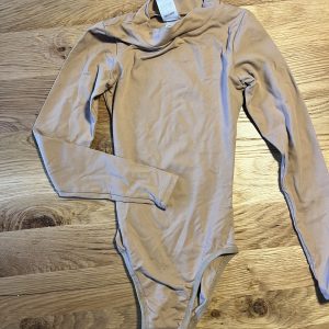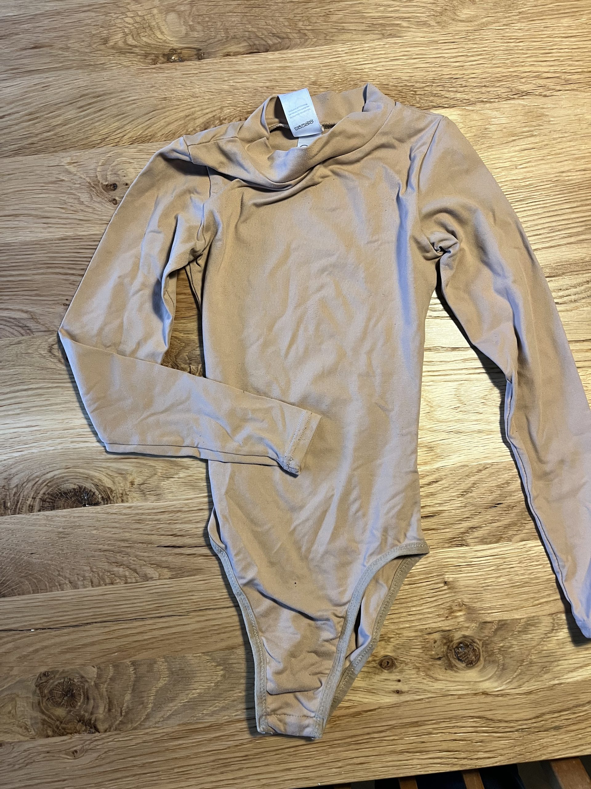 gebrauchter Mondor-Kürbody mit kleinem Kragen und drei Druckknöpfen im Schritt, hautfarben, dünner Stoff.